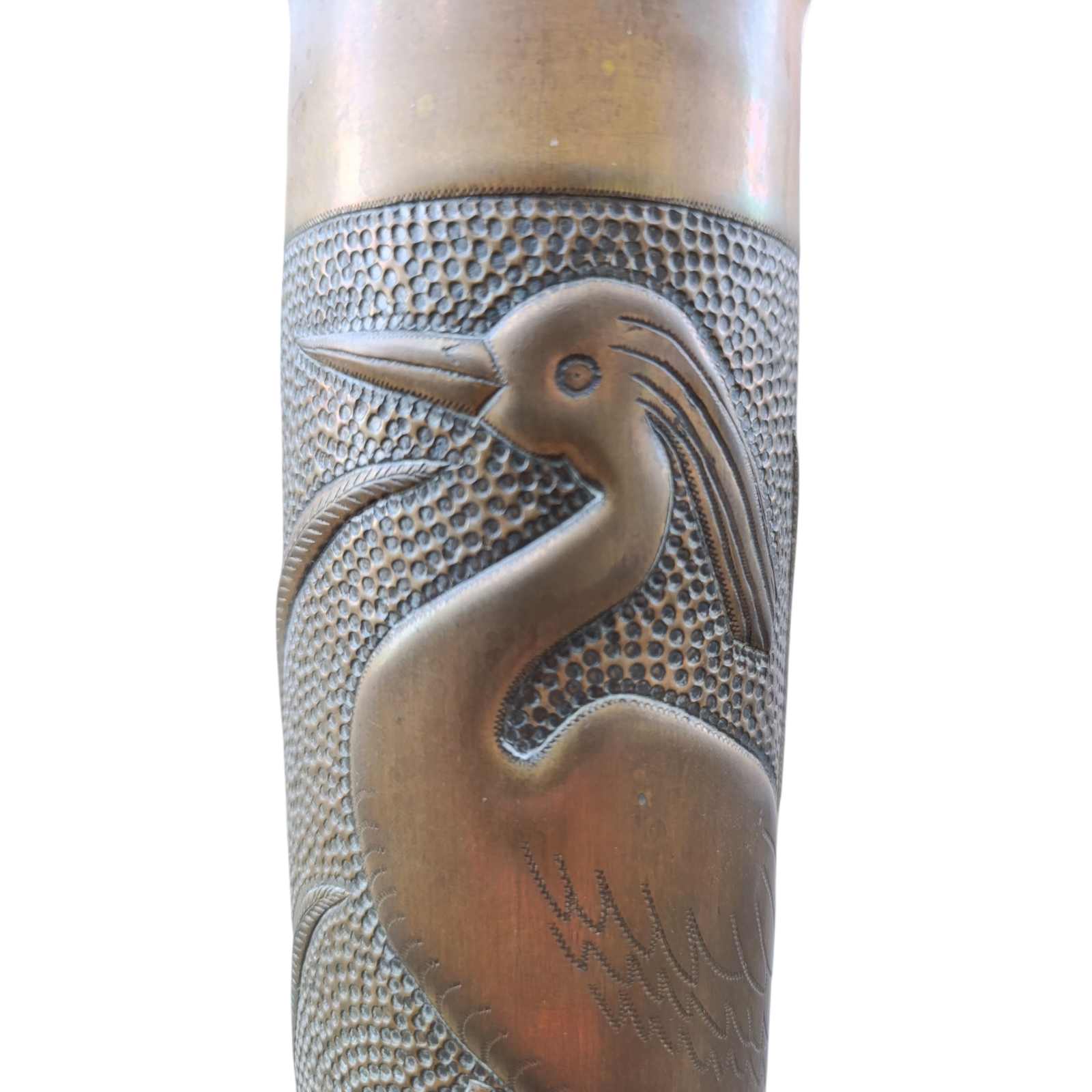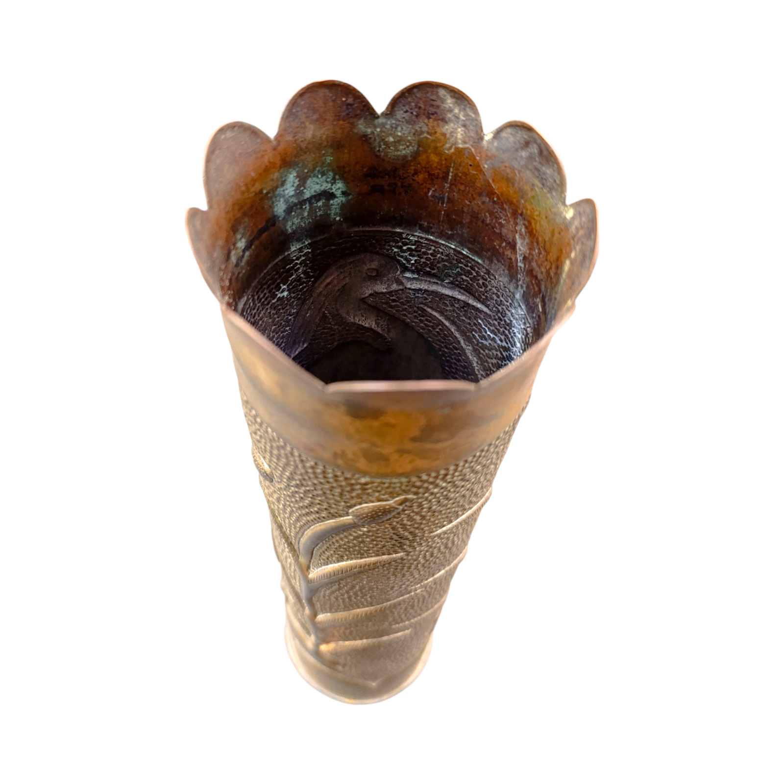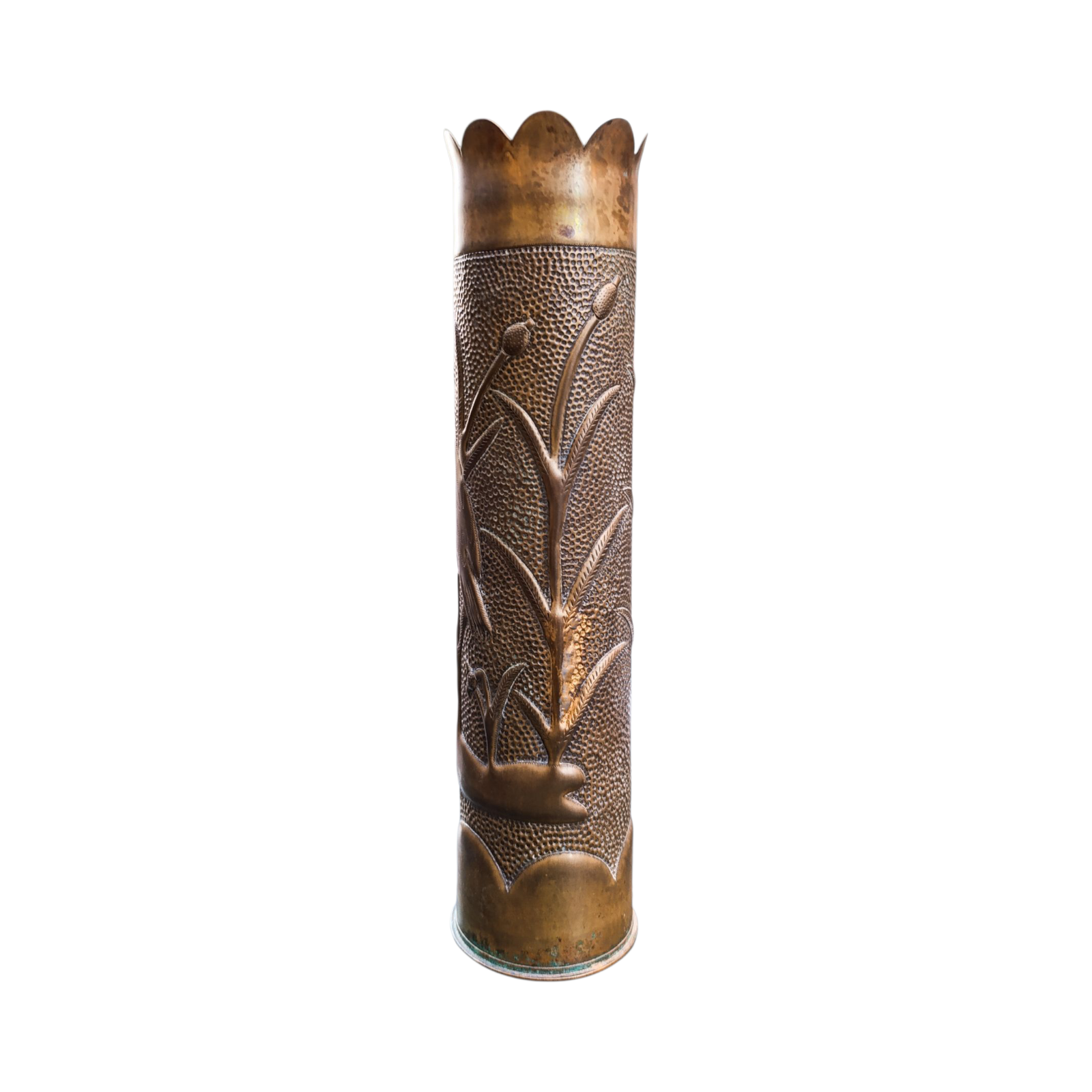 Proiettile da cannone, lavorato e trasformato in contenitore o vaso, con decori a incisione sulla parte esterna, realizzati durante la prima guerra mondiale da un ignoto soldato italiano in trincea
