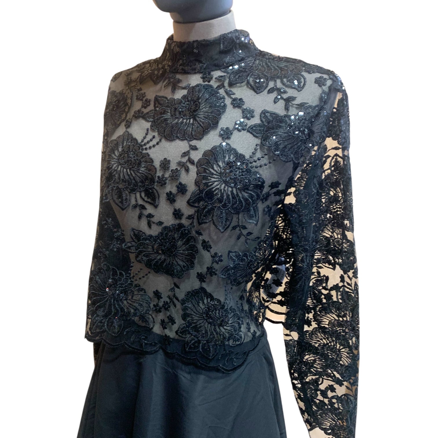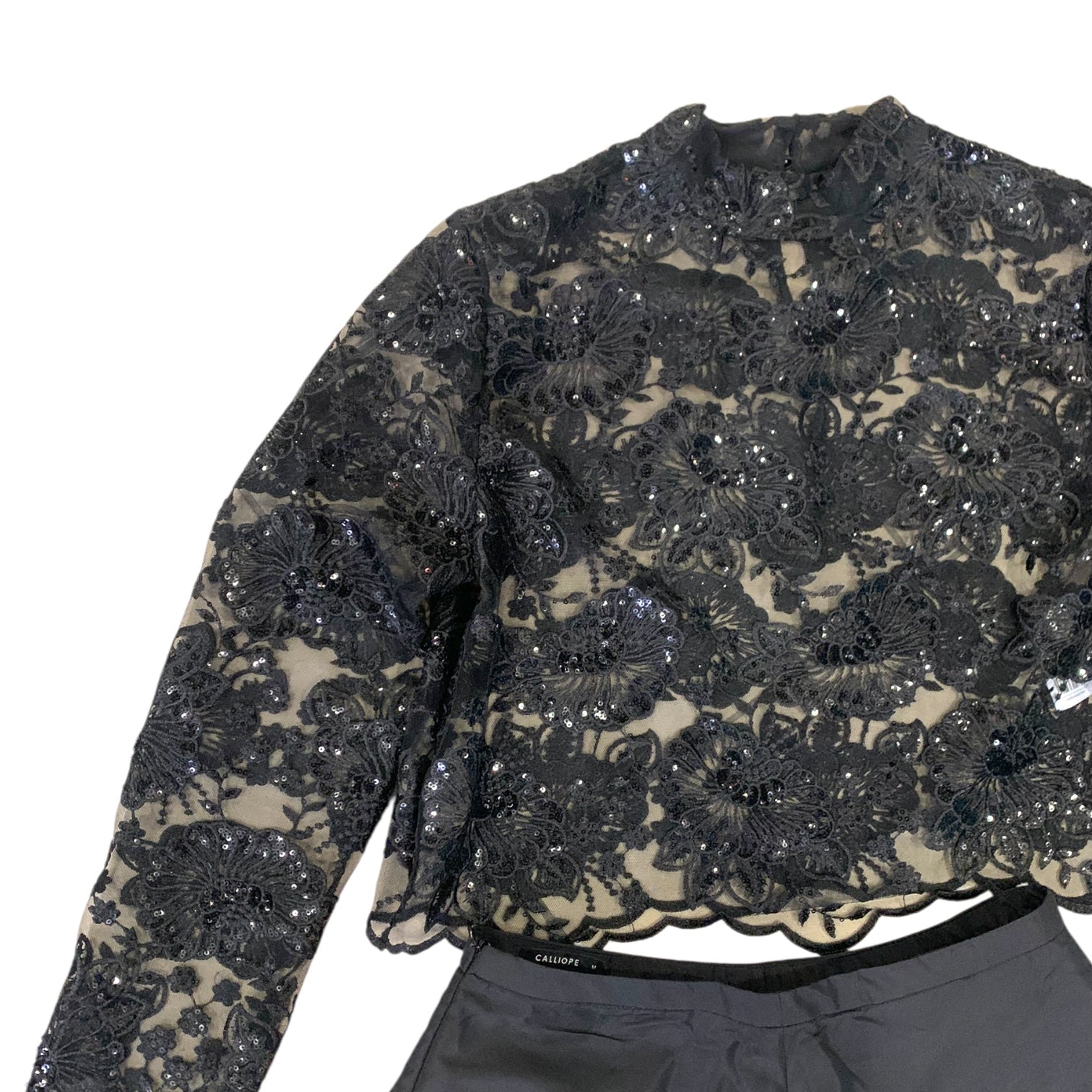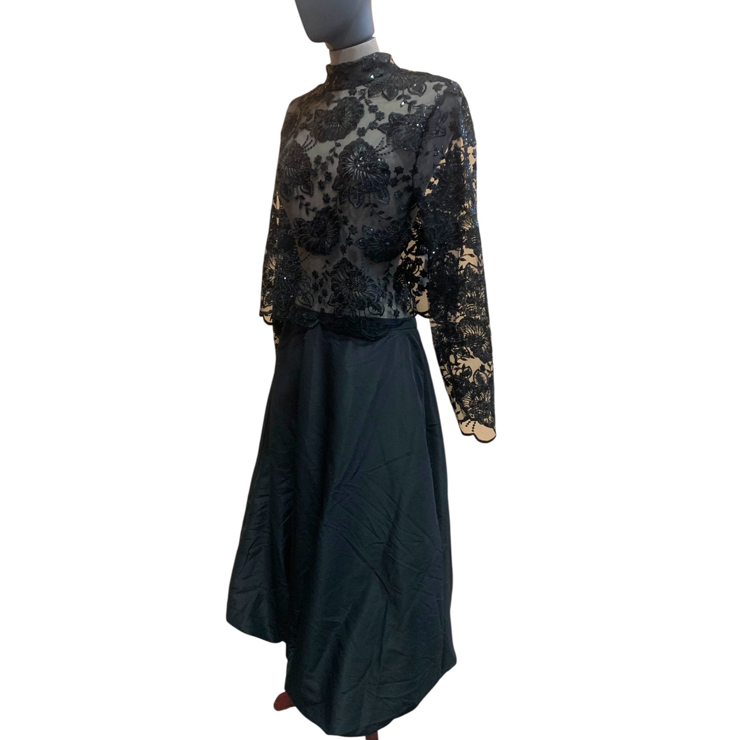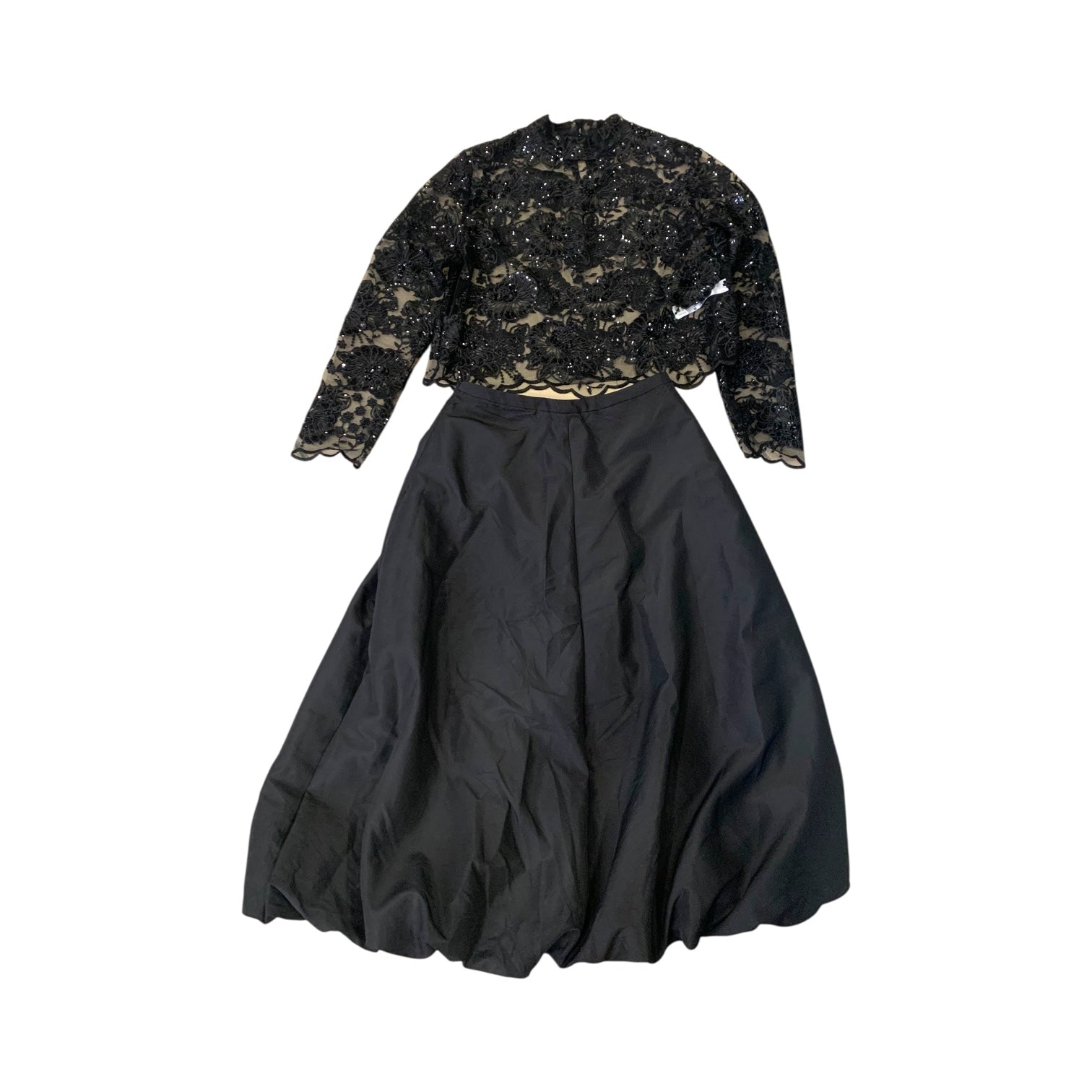 Completo donna Calliope composta da maglia in pizzo e paillettes e gonna a campana colore nero. Taglia M