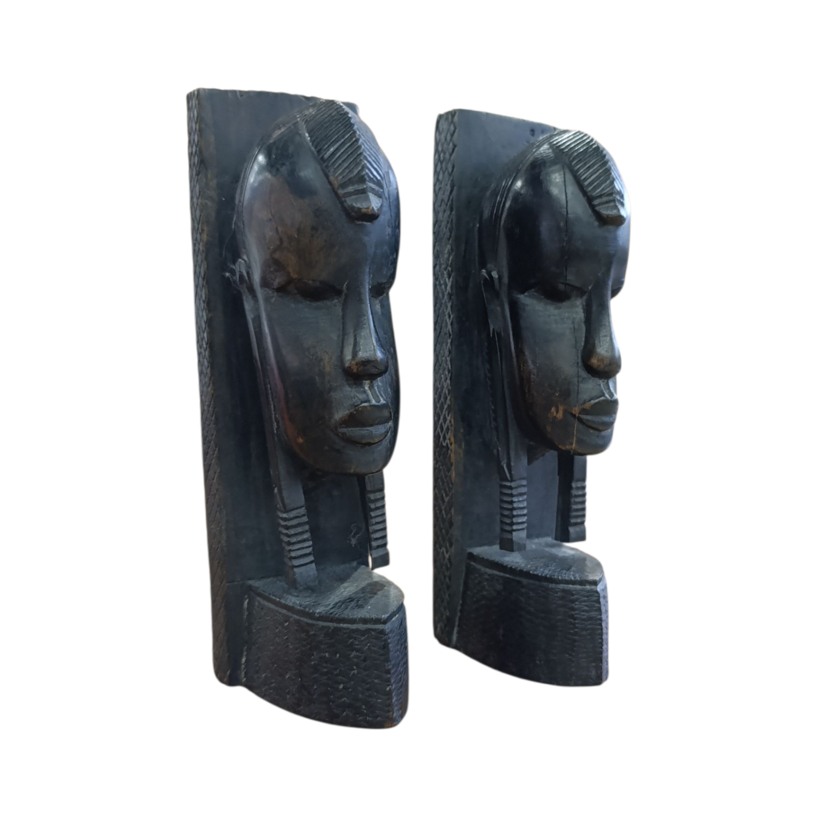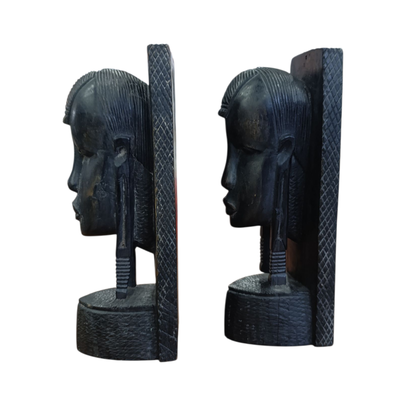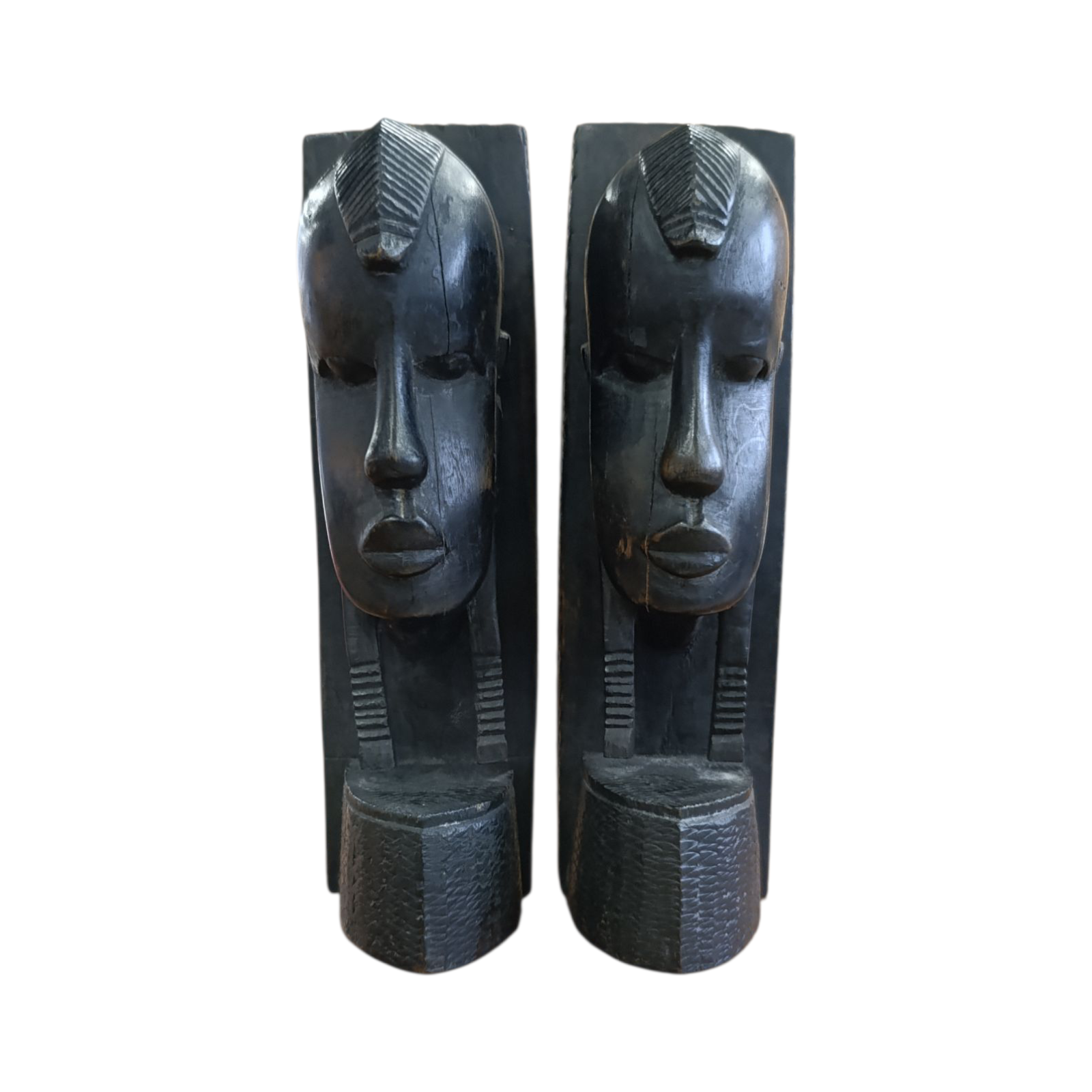 Coppia di ferma libri etnici, raffiguranti volti femminili, realizzati a mano in Tanganica negli anni 60-70, in ebano