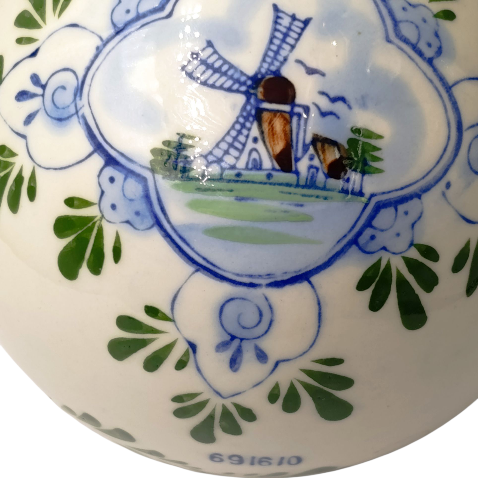 Palla di Natale in ceramica Delft, Paesi Bassi, bianca con decori blu e verdi, raffiguranti mulini a vento e abbellimenti floreali