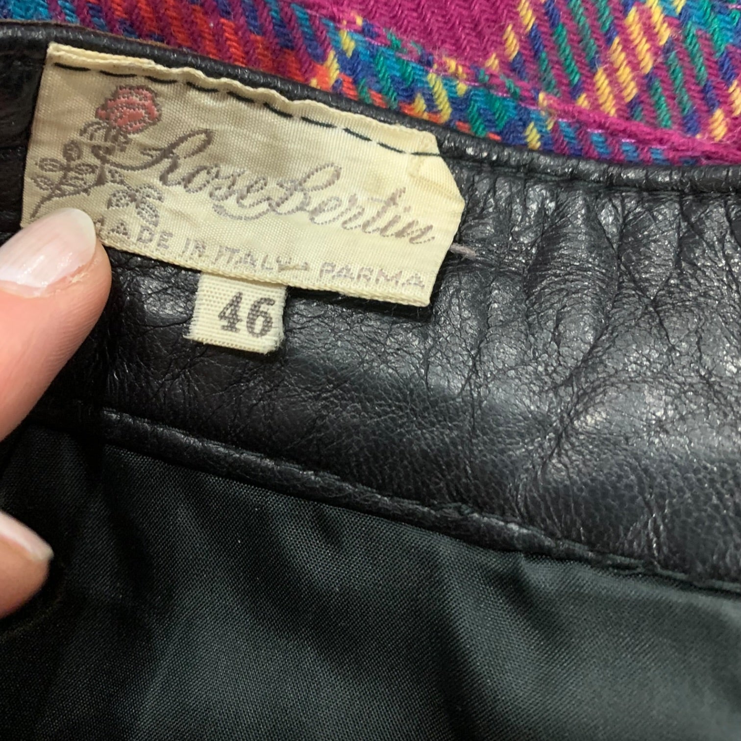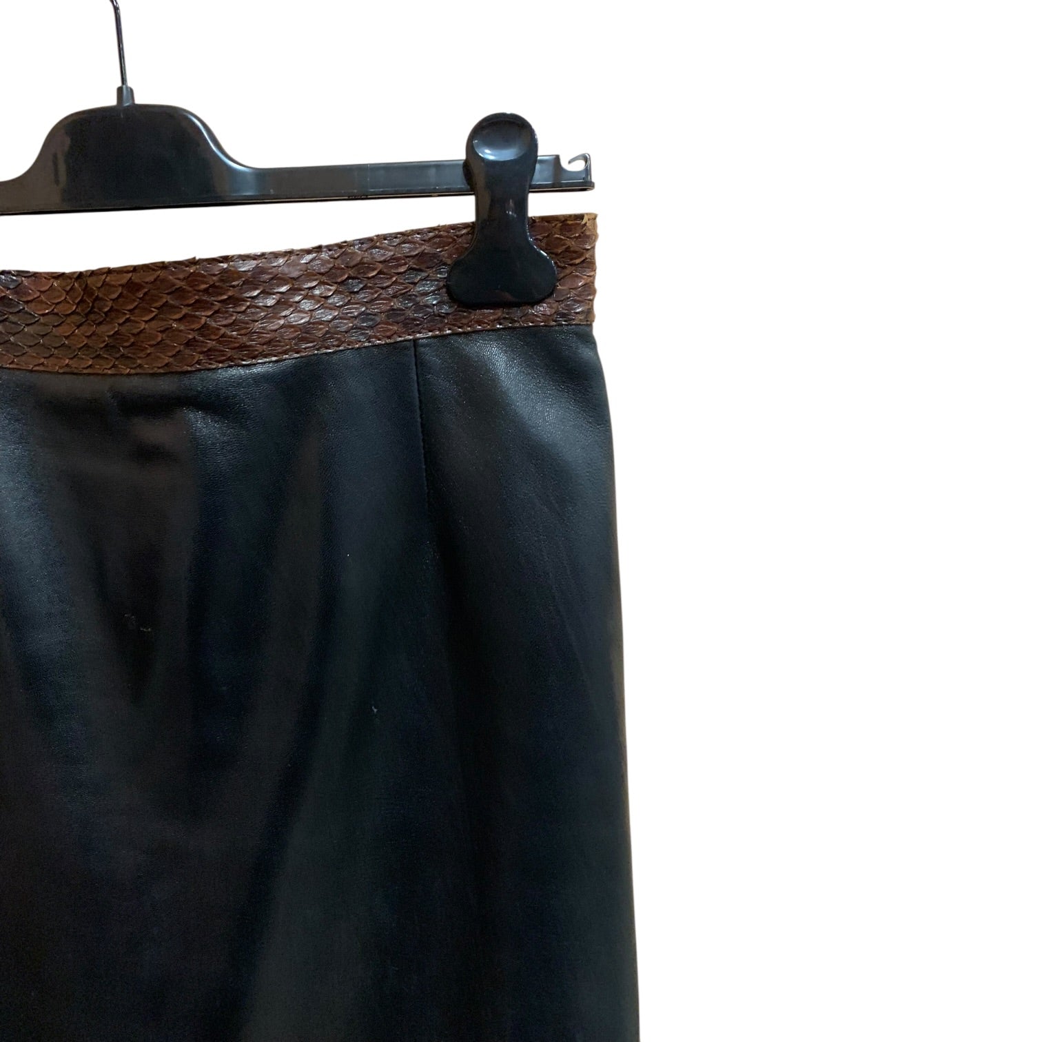 Gonna a tubino vintage in pelle nero con bordo serpente marrone. Taglia etichetta 46