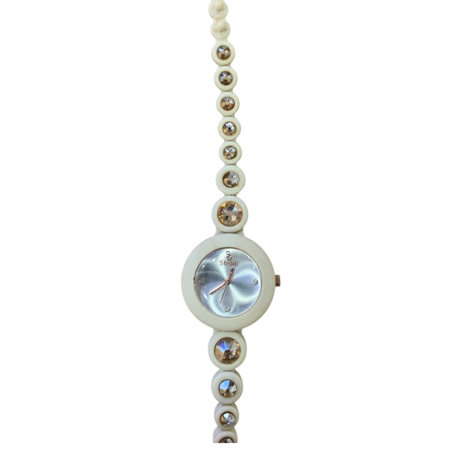 Orologio bracciale marca Stroili con cinturino in silicone beige e brillantini. Orologio funzionante