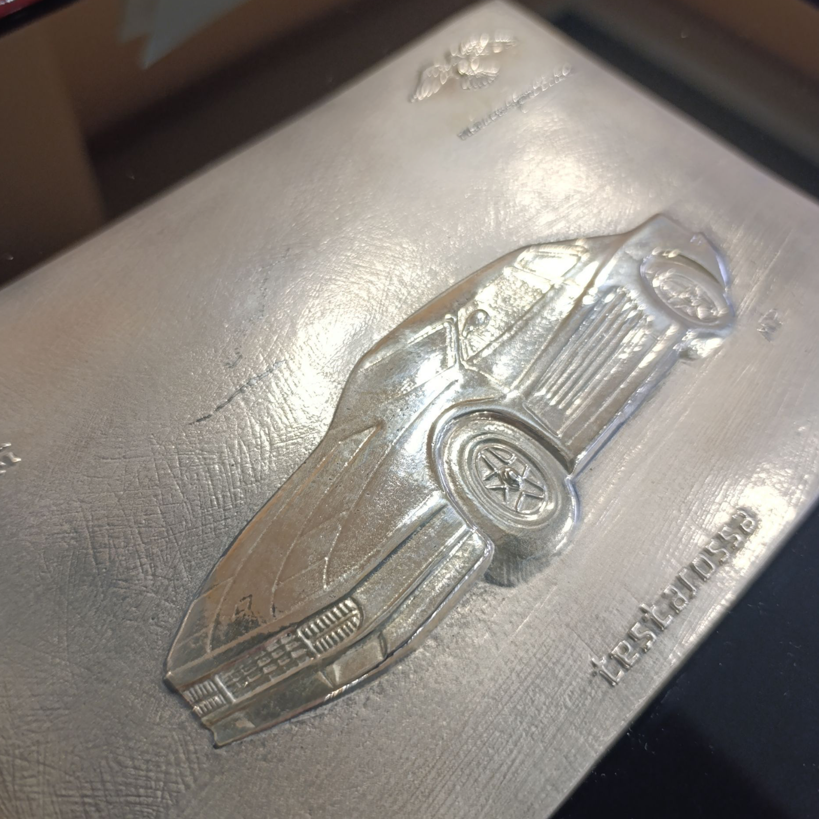Targa in argento 999,9 peso 99 grammi, dimensione 23 x 16 cm, montata su supporto nero lucido con cornice rossa dimensione 45,5 x 39 cm, peso complessivo 1,7 Kg.