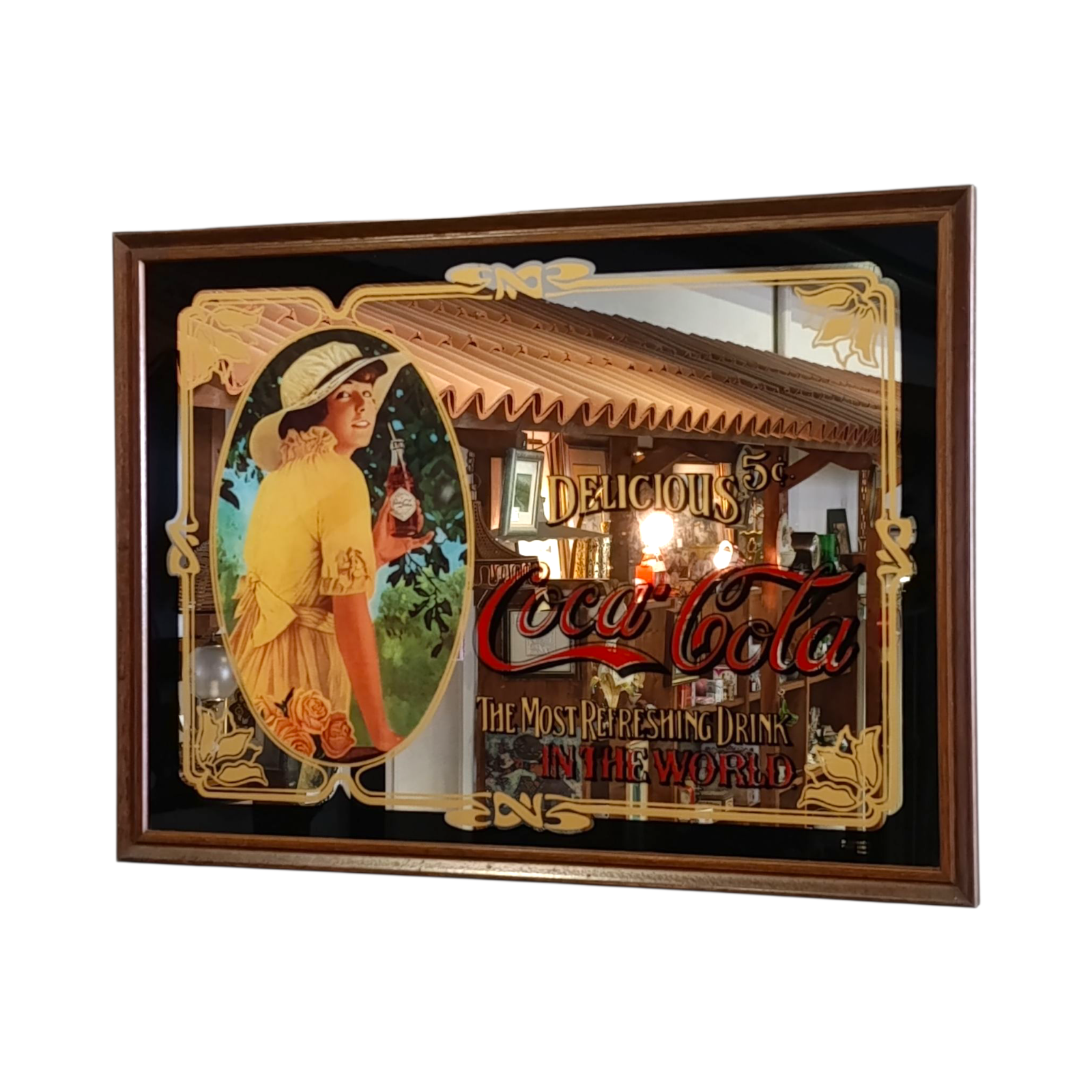 Specchio pubblicitario vintage, delicious Coca Cola 5 cent, The Most Refreshing Drink in the world, con grafica art decò ispirata agli anni 20