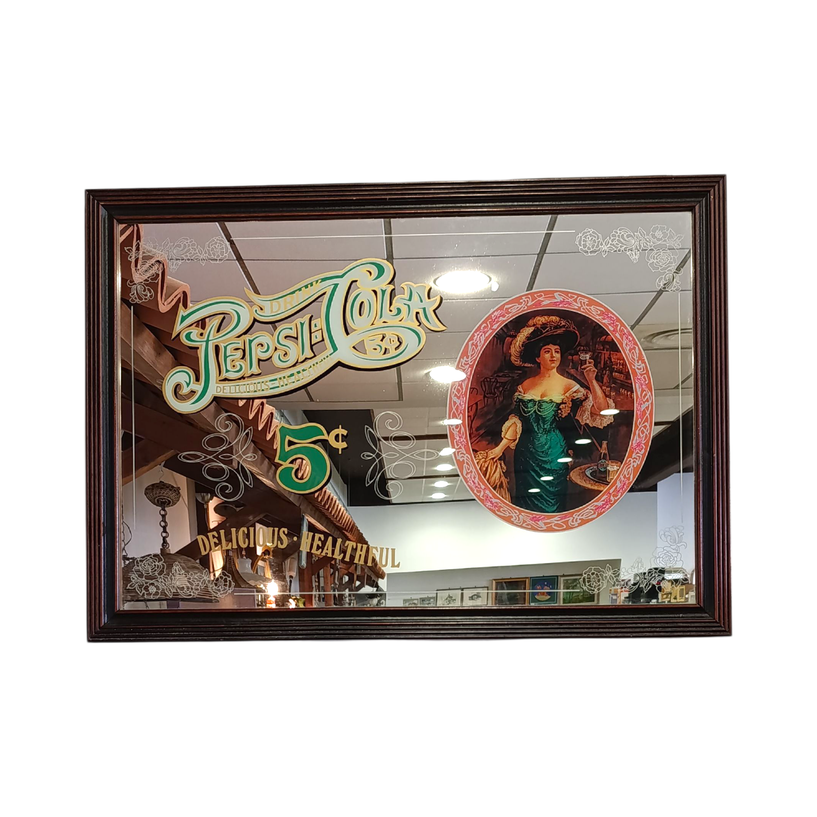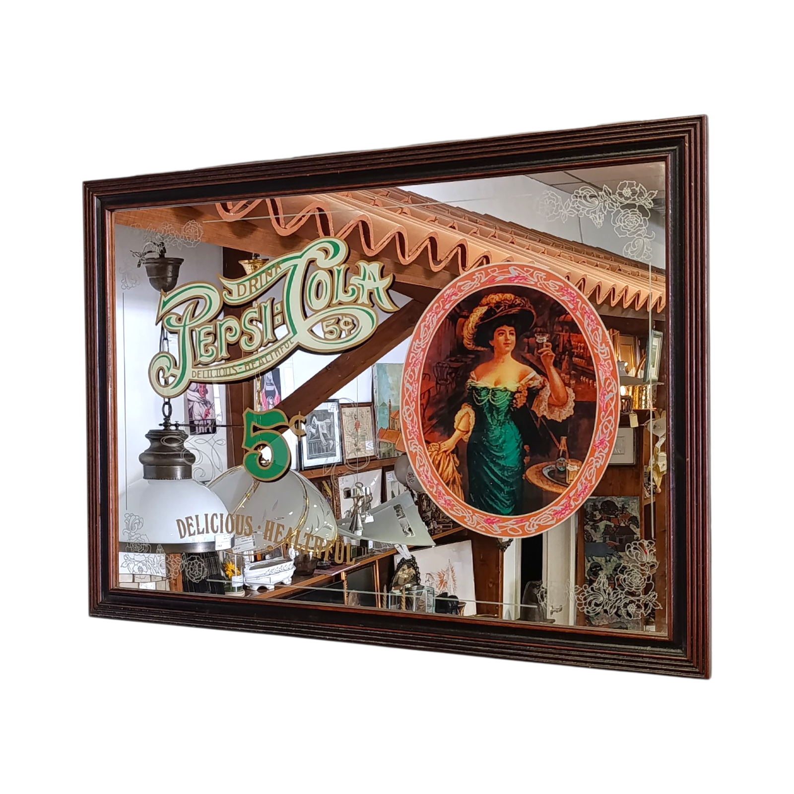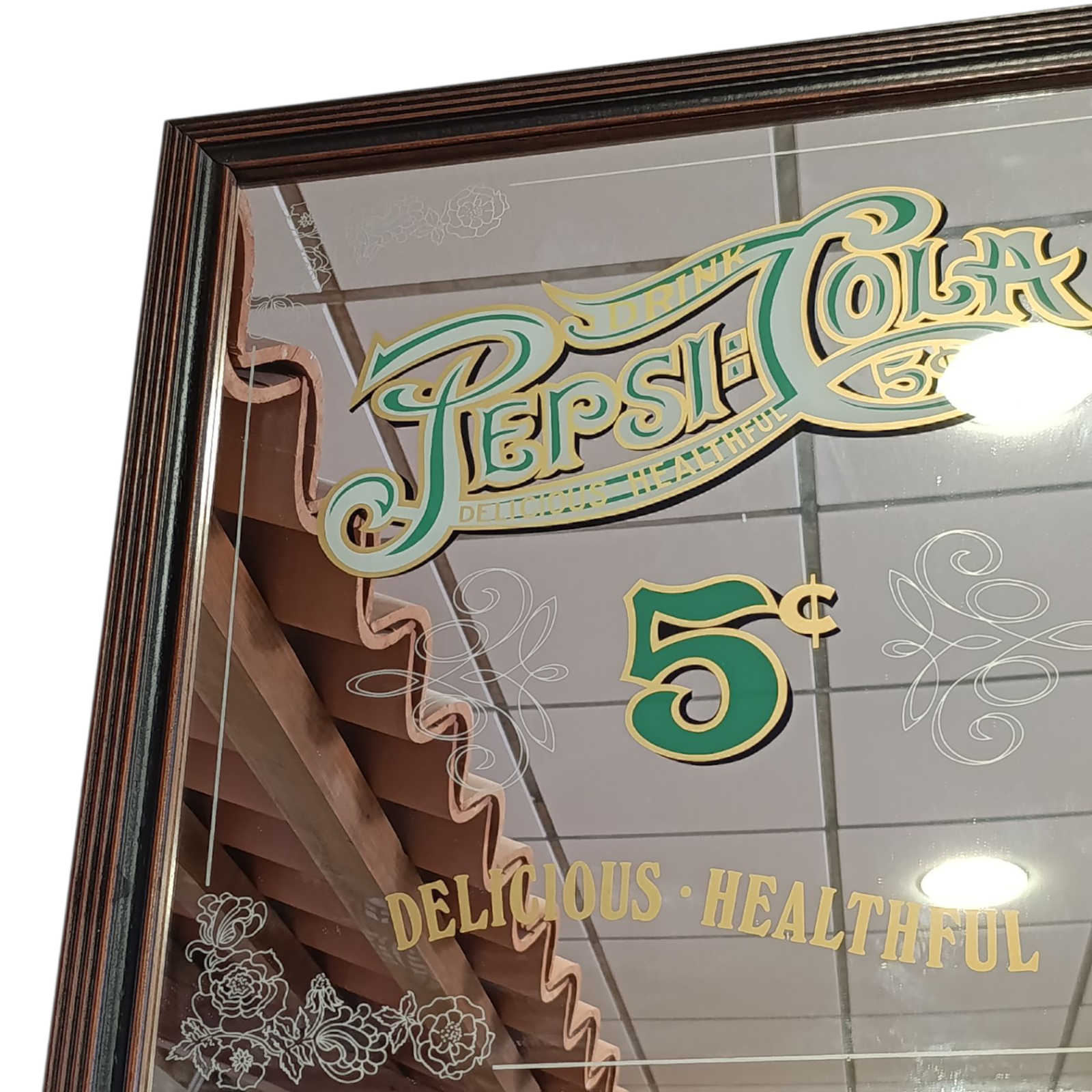 Specchio pubblicitario vintage, drink Pepsi-Cola, Delicious Healthful 5 cent e grafica ispirata agli anni 20.