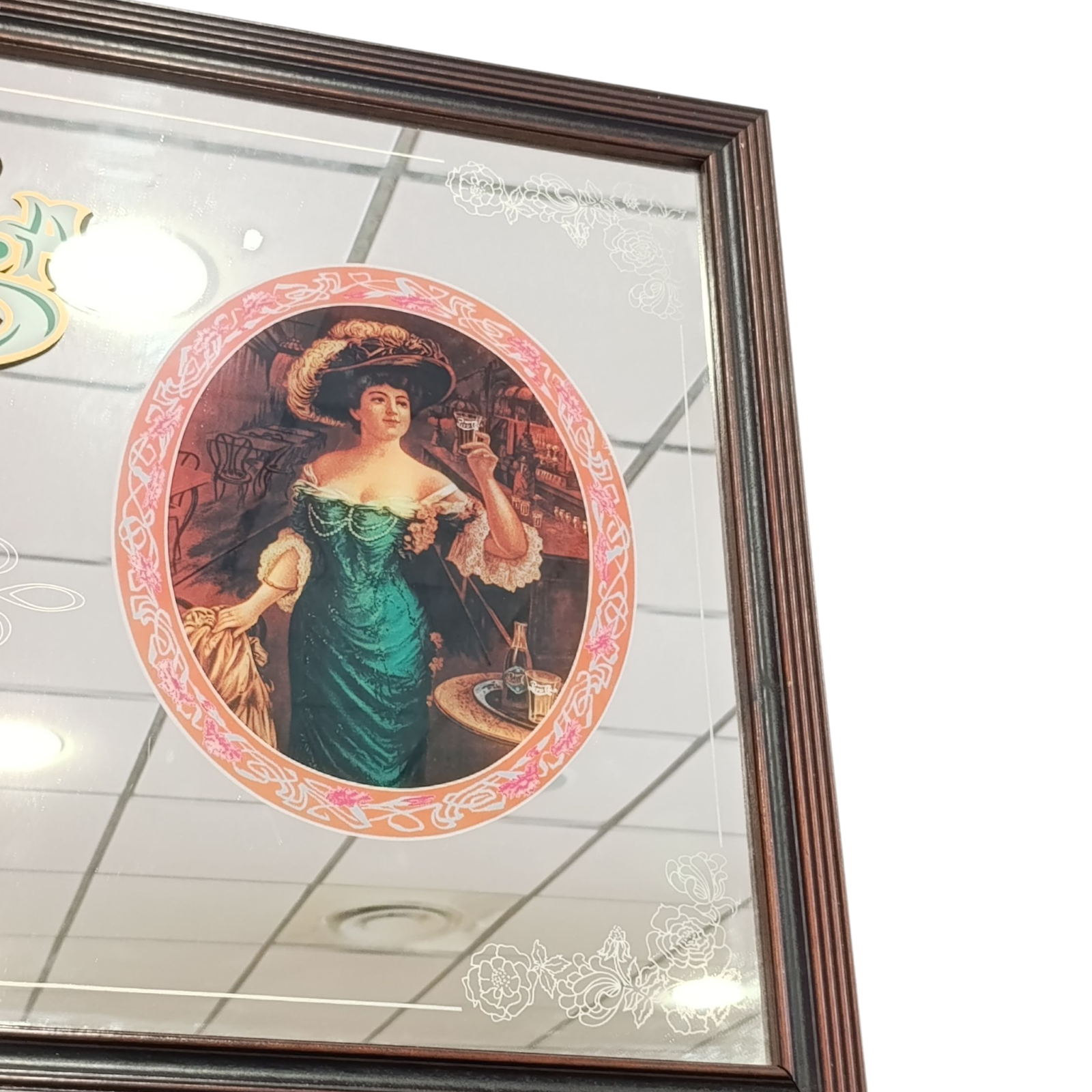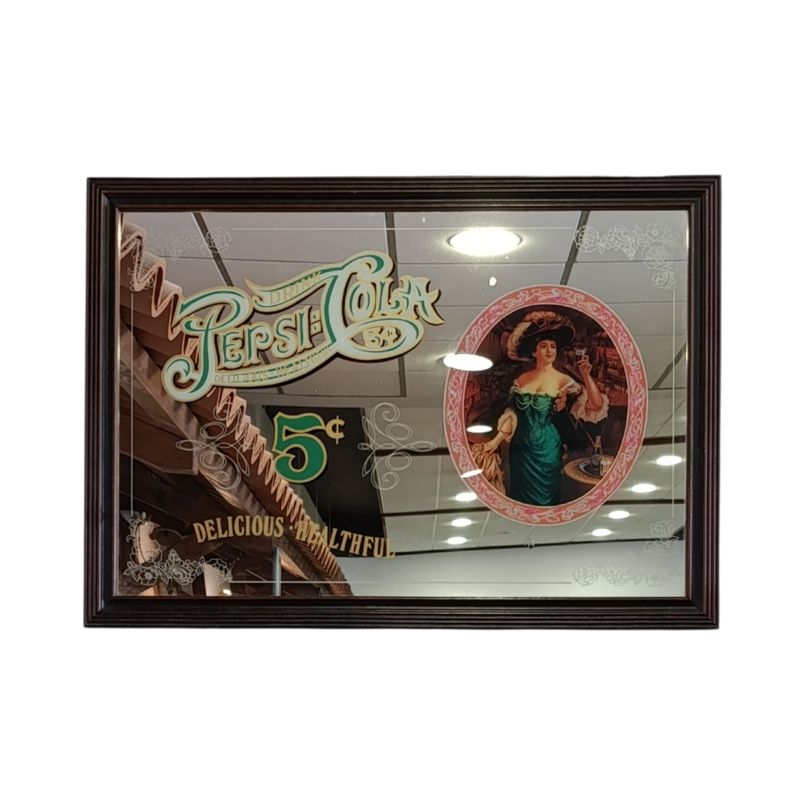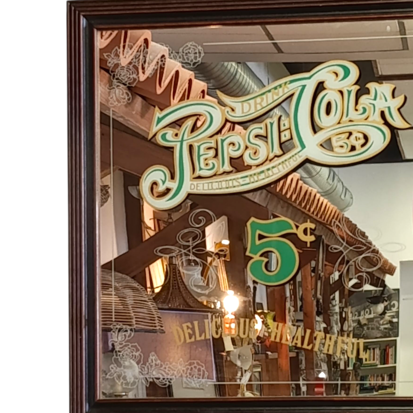Specchio pubblicitario vintage, drink Pepsi-Cola, Delicious Healthful 5 cent e grafica ispirata agli anni 20.