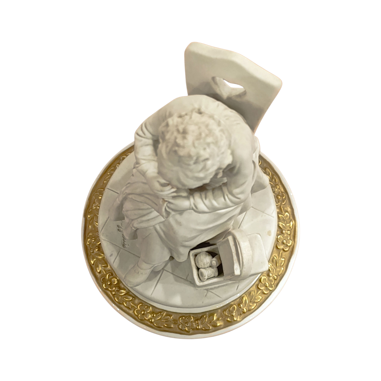 Statuina Capodimonte in porcellana biscuit firmata Sandro Maggioni, bimba che cuce